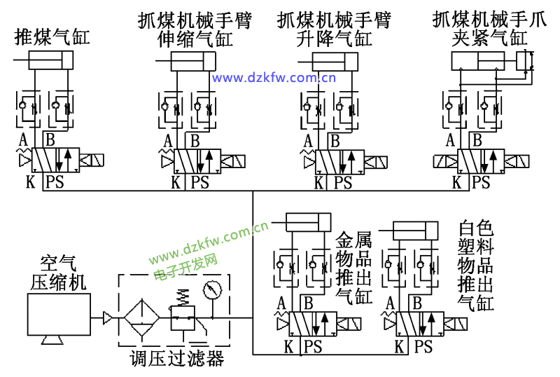 氣動控制是既經濟又安全可靠的一種控制方式,在煤炭輸送控制系統中,煤炭的推出、抓煤機械手臂伸縮和升降、手爪的夾緊及煤炭中金屬及塑料物品的推出等動作都利用氣缸來實現,通過6個電磁換向閥對6個氣缸進行控制。煤炭輸送機的氣動控制原理如圖2所示。