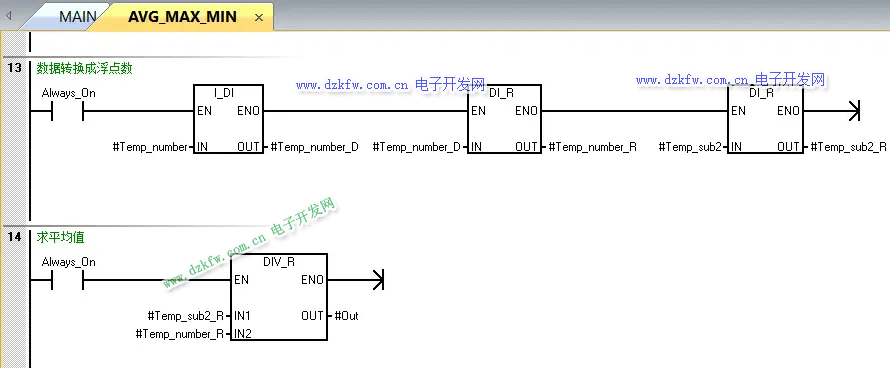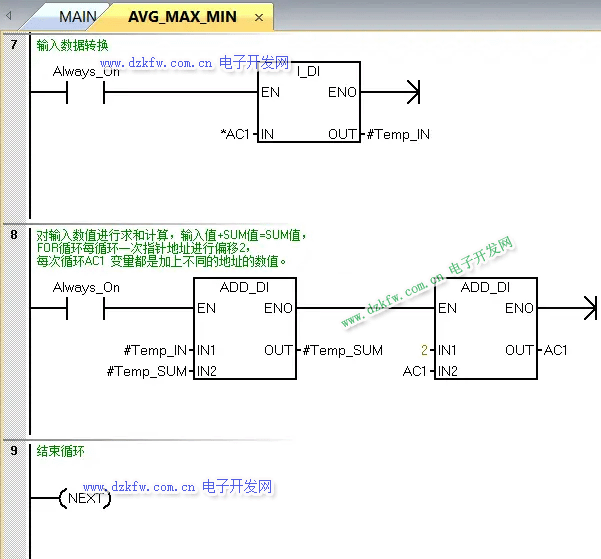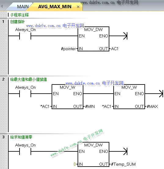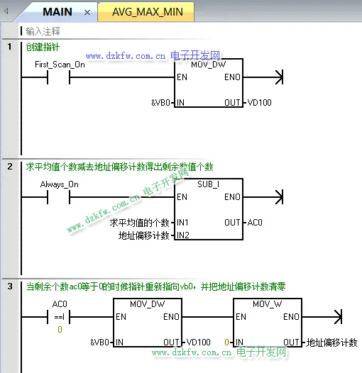 AVG_MAX_MIN子程序每一段程序都有注釋講解,如圖3至圖7所示,這里不做介紹,如果有問題可以留言。