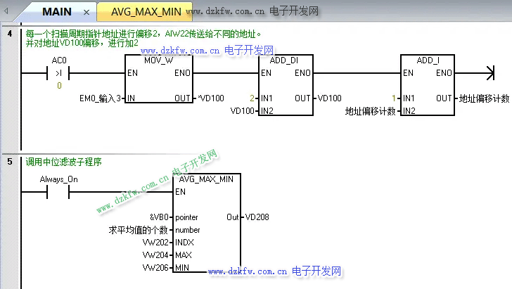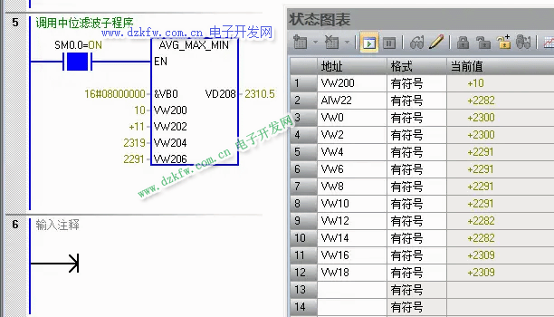 程序檢控可以看到模擬量采集的10個數值進行減去最大和最小值,然后求8個數的平均值,并輸出到VD208中。