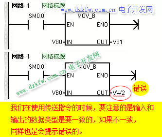 除此之外,我們在使用傳送指令的時候,要注意的是輸入和輸出的數(shù)據(jù)類型是要一致的,如果不一致,同樣也是會提示錯誤的。