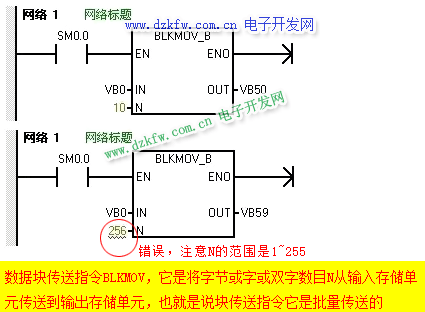那么數(shù)據(jù)塊傳送指令BLKMOV,它是將字節(jié)或字或雙字?jǐn)?shù)目N從輸入存儲單元傳送到輸出存儲單元,也就是說塊傳送指令它是批量傳送的,注意N的范圍是1~255,使用的時候要注意不能超限。那么下面這條指令也就是將VB0~VB9的里面的數(shù)據(jù)傳送到VB50~VB59里面。