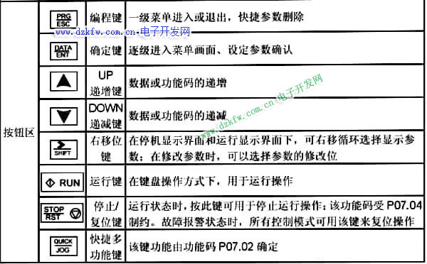 在三級菜單操作時,可按PRG/ESC鍵或DATA/ENT鍵返回二級菜單。兩者之間的區別是,按DATA/ENT鍵將設定參數存入控制板,然后再返回二級菜單,并且自動轉移到下一個功能碼;按PRG/ESC鍵則可以直接返回二級菜單,不儲存參數,并保持停留在當前功能碼中。