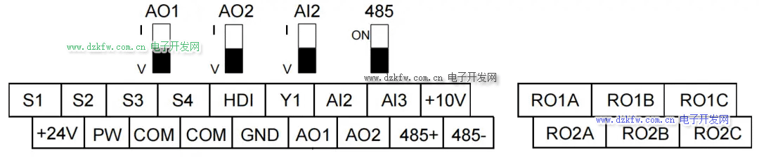 200SMART PLC支持MODBUS通信協議,英威騰GD20變頻器也支持MODBUS通信協議,變頻器的控制回路端子示意圖如下: