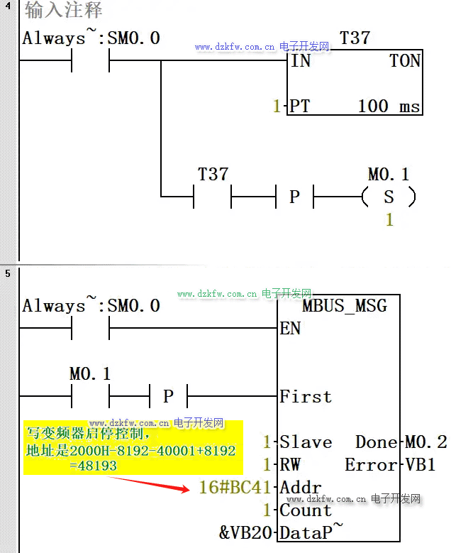 變頻器啟停控制地址是2000H,需將其轉換成MODBUS映射地址,先將其轉換為十進制數8192,8192<9999,所以MODBUS映射地址為40001+8192=48193,轉換為16進制數是16#BC41。