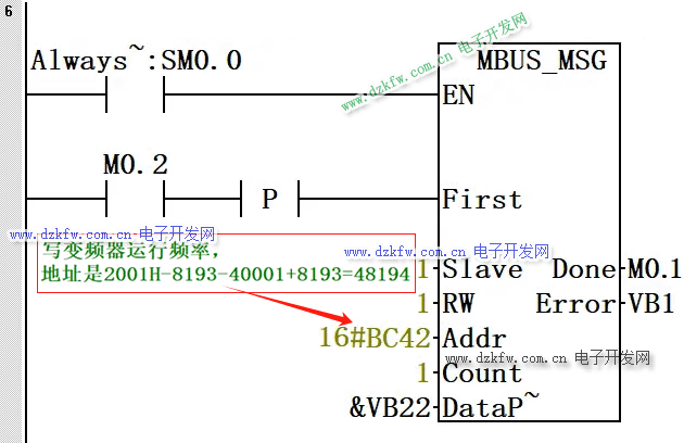 變頻器頻率設定地址是2001H,也需將其轉換成MODBUS映射地址,先將其轉換為十進制數8193,8193<9999,所以MODBUS映射地址為40001+8193=48194,轉換為16進制數是16#BC42。
