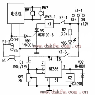 當(dāng)撥通家中的電話后,振鈴信號(hào)經(jīng)VD1整流,觸發(fā)單向可控硅VS導(dǎo)通,繼電器K1得電工作,常開(kāi)接點(diǎn)K1-1、K1-2閉合,電話機(jī)摘機(jī),駐極體話筒BM2得電工作,你便可以聽(tīng)到家中的各種響動(dòng),同時(shí)繼電器K1常開(kāi)觸點(diǎn)K1-3閉合,由NE555組成的延時(shí)電路得電工作,此時(shí)NE555的{3}腳輸出低電位,繼電器K2釋放,經(jīng)過(guò)幾分鐘的延時(shí)(此時(shí)間可通過(guò)調(diào)整RP1改變),NE555的{3}腳輸出高電位,繼電器K2得電工作,其常閉觸點(diǎn)K2-1斷開(kāi),繼電器K1斷電釋放,其常開(kāi)觸點(diǎn)K1-1、K1-2斷開(kāi),電話機(jī)掛機(jī),其常開(kāi)觸點(diǎn)K1-3斷開(kāi),又引起延時(shí)電路斷電,繼電器K2斷電釋放,其常閉接點(diǎn)K2-1吸合,整個(gè)電路復(fù)原,等待下一次的工作。