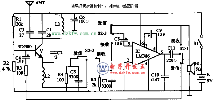 電路如圖所示。三極管V和電感線圈L1、電容器C1、C2等組成電容三點式振蕩電路,產生頻率約為100MHz的載頻信號。集成功放電路LM386和電容器C8、C9、C10、Cll等組成低頻放大電路。揚聲器BL兼作話筒使用。電路工作在接收狀態時,將收/發轉換開關置于“接收”位置,從天線ANT接收到的信號經三極管V、電感線圈L1、電容器C1、C2及高頻阻流圈L2等組成的超再生檢波電路進行檢波。檢波后的音頻信號,經電容器C8耦合到低頻放大器的輸入端,經放大后由電容器Cll耦合推動揚聲器BL發聲。