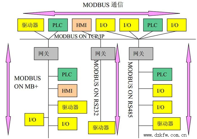 Modbus協議允許在各種網絡體系結構內進行簡單通信,每種設備(PLC、人機界面、控制面板、驅動程序、輸入輸出設備)都能使用Modbus協議來啟動遠程操作,一些網關允許在幾種使用Modbus協議的總線或網絡之間的通信。