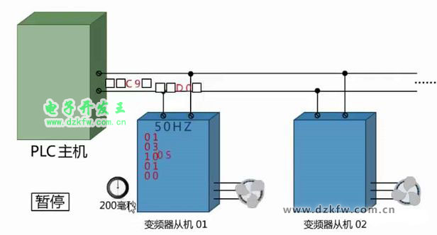 舉例:plc 向變頻器從機1和變頻器從機2傳遞數據,首先變頻器從機1和變頻器從機2設備之間必須通過電纜連接(硬件連接)。如果變頻器從機1和變頻器從機設備發送101010這樣一串代碼,那么變頻器從機1就要在他的通訊端口產生如下圖所示的高低電平的組合,通過電纜這個介質變頻器從機2設備的通訊端口就會接收到A設備發出高低電平的組合,同時就會將接收到的高低電平組合翻譯成101010,這就完成了PLC 向兩臺變頻器從機1設備數據的傳遞。