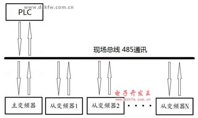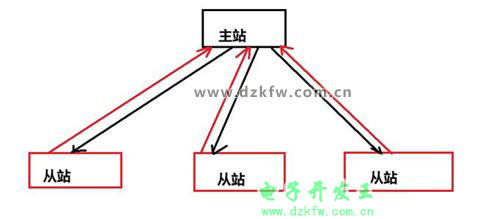 是在一個通訊網絡中一個站點是主站,其他站點作為從站。主站和從站之間可以直接進行數據的傳遞,但是從站與從站之間不能直接進行數據的傳遞。如果需要從站之間交換數據也必須要通過主站進行轉發。如下圖所示