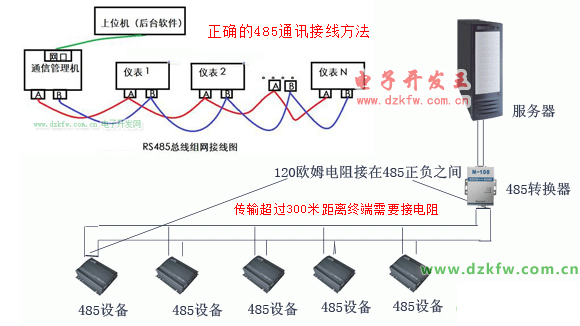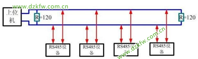 如果通訊距離比較短或者所掛接的從機設備比較少,那么終端電阻是可以不接的,但是隨著距離的增加和從機設備的增多,信號在總線末端容易引起反射,導致通訊不穩定。為了消除這種反射就會在總線的末端加一個終端電阻,終端電阻的經驗值一般為120Ω。般情況下不需要增加終端電阻,只有在485通信距離超過300米的情況下,要在485通訊的開始端和結束端增加終端電阻。終端電阻的位置具體如下圖所示。