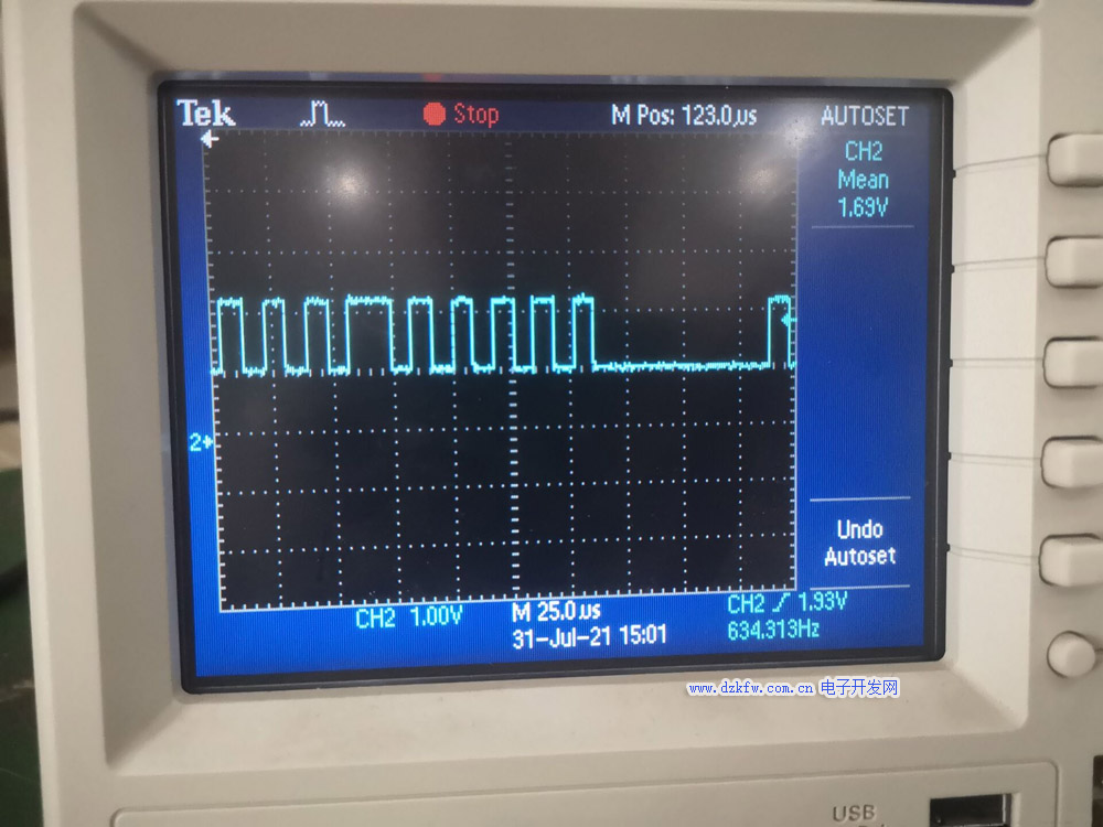 所用示波器為 漢泰的 IDSO1070。從光標測量可以看出AB之間的時間為107.422 μs,和計算的104 μs 差不多。