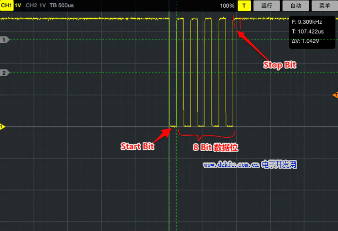 假如要測量波特率為9600,則每一比特位的時間為:1/9600=104us。一般示波器橫向表示時間,
