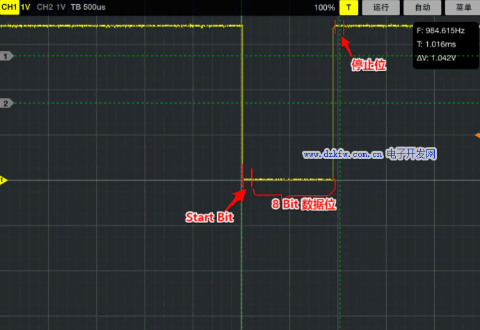 假如要測量的波特率為9600, 則每一比特位的時間為:1/9600 ≈ 104 μs,一般示波器橫向上每個大格子里5個小格子,要想看清一比特位一般需要一個小格子就夠了,則時基為:104 μs * 5 = 520 μs, 也就是說時基要500 μs。
