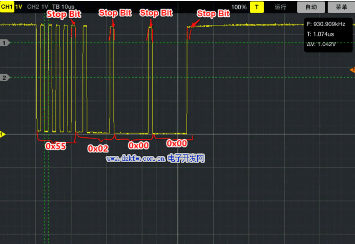 已知發送數據位0x55020000, 0x55 的2進制位為10101010。
