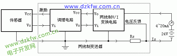 2.兩線制變送器的結構與原理 兩線制變送器的原理是利用了4~20mA信號為自身提供電能。如果變送器自身耗電大于4ma,那么將不可能輸出下限4ma值。因此一般要求兩線制變送器自身耗電(包括傳感器在內的全部電路)不大于3.5mA。這是兩線制變送器的設計根本原則之一。 從整體結構上來看,兩線制變送器由三大部分組成:傳感器、調理電路、兩線制v/i變換器構成。傳感器將溫度、壓力等物理量轉化為電參量,調理電路將傳感器輸出的微弱或非線性的電信號進行放大、調理、轉化為線性的電壓輸出。兩線制v/i變換電路根據信號調理電路的輸出控制總體耗電電流;同時從環路上獲得電壓并穩壓,供調理電路和傳感器使用。 除了v/i變換電路之外,電路中每個部分都有其自身的耗電電流,兩線制變送器的核心設計思想是將所有的電流都包括在v/i變換的反饋環路內。如圖,采樣電阻rs串聯在電路的低端,所有的電流都將通過rs流回到電源負極。從rs上取到的反饋信號,包含了所有電路的耗電。在兩線制變送器中,所有的電路總功耗不能大于3.5mA,因此電路的低功耗成為主要的設計難點。下面將逐一分析各個部分電路的原理與設計要點。