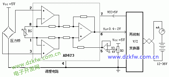 4.兩線制壓力變送器設計 壓力橋、稱重傳感器輸出信號微弱,都屬于mv級信號。這一類小信號一般都要求用差動放大器對其進行第一級放大。一般選用低失調、低溫飄的差動放大器。另外在兩線制應用中,低功耗也是必需的。ad623是常用的低功耗精密差動放大器,常用在差分輸出前級的放大。 ad623失調最大200uv,溫飄1uv/度,在一般壓力變送應用保證了精度足夠。 r0將0.4v疊加在ad623的ref腳(5腳)上,在壓力=0情況下通過調整r0使輸出4ma,再調整rg輸出20.00mA,完成校準。 電路設計時需注意,壓力橋傳感器相當于一個千歐級的電阻,耗電一般比較大。適當降低壓力橋的激勵電壓可以減小耗電電流。但是輸出幅度也隨之下降,需要提高ad623的增益。圖6給出的傳感器采用恒壓供電,實際應用中大部分半導體壓力傳感器需要恒流供電才能獲得較好的溫度特性,可以用一個運放構成恒流源為其提供激勵。