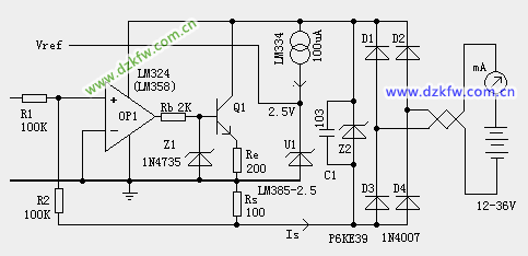 5.穩定性和安全性的考慮 工業環境下環境惡劣且對可靠性要求高,因此兩線制變送器的設計上需要考慮一定的保護和增強穩定性措施。 1.電源保護。 電源接反、超壓、浪涌是工業上常見的電源問題。電源接反是設備安裝接線時最容易發生的錯誤,輸入口串一只即可防止接反電源時損壞電路。如果輸入端加一個全橋整流器,那么即使電源接反仍能正常工作。為防止雷擊、靜電放電、浪涌等能量損壞變送器,變送器入口處可以加裝一只tvs管來吸收瞬間過壓的能量。一般tvs電壓值取比運放極限電壓略低,才能起到保護作用。如果可能遭受雷擊,tvs可能吸收容量不夠,壓敏電阻也是必需的,但是壓敏電阻本身漏電會帶來一定誤差。 2.過流保護。 設備運行過程中可能有傳感器斷線、短路等錯誤情況發生。或者輸入量本身很有可能超量程,變送器必須保證任何情況下輸出不會無限制上升,否則有可能損壞變送器本身、電源、或者遠方顯示儀表。 圖中rb和z1構成了過流保護電路。無論什么原因導致op1輸出大于6.2v(1n4735是6.2v穩壓管),都會被z1鉗位,q1的基極不可能高于6.2v。因此re上電壓不可能高于6.2-0.6=5.6v,因此總電流不會大于ue/re = 5.6v/200=28mA。 3.寬電壓適應能力。 一般兩線制變送器都能適應大范圍的電壓變化而不影響精度。這樣可以適用各類電源,同時能夠適應大的負載電阻。對電源最敏感的部分是基準源,同時基準源也是決定精度的主要元件。3樓圖中基準通過r5限流,當電源電壓變化時,r5上電流也隨之改變,對基準穩定性影響很大。附圖中利用恒流源lm334為基準供電,電壓大范圍變化時,電流基本不變,保證了基準的穩定性。 4.退藕一般的電路設計中,每個集成電路的電源端都會有退藕電容。在兩線制變送器上電時,這些電容的充電會在瞬間導致大電流,有可能會損壞遠方儀表。因此每個退藕電容一般不超過10nf,總退藕電容不宜超過50nf。入口處一個10nf電容是必需的,保證長線感性負載下,電路不震蕩。
