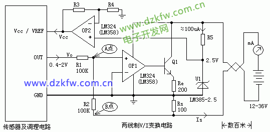 3.兩線制v/i變換器 v/i 變換器是一種可以用電壓信號控制輸出電流的電路。兩線制v/i變換器與一般v/i變換電路不同點在:電壓信號不是直接控制輸出電流,而是控制整個電路自身耗電電流。同時,還要從電流環路上提取穩定的電壓為調理電路和傳感器供電。附圖是兩線制v/i變換電路的基本原理圖: 圖中op1、q1、r1、r2、rs構成了v/i變換器。分析負反饋過程:若a點因為某種原因高于0v,則運放op1輸出升高,re兩端電壓升高,通過re的電流變大。相當于整體耗電變大,通過采樣電阻rs的電流也變大,b點電壓變低(負更多)。結果是通過r2將a點電壓拉下來。反之,若a點因某種原因低于0v,也會被負反饋抬高回0v。總之,負反饋的結果是運放op1虛短,a點電壓=0v。下面分析vo對總耗電的控制原理: 假設調理電路輸出電壓為vo,則流過r1的電流 i1=vo/r1 運放輸入端不可能吸收電流,則i1全部流過r2,那么b點電壓 vb= -i1*r2 = -vo*r2/r1 取r1=r2時,有vb=-vo 電源負和整個便送器電路之間只有rs、r2兩個電阻,因此所有的電流都流過rs和r2。r2上端是虛地(0v),rs上端是gnd。因此r2、rs兩端電壓完全一樣,都等于vb 。相當于rs與 r2并聯作為電流采樣電阻。因此電路總電流: is=vo/(rs//r2) 如果取r2>;>;rs,is=vo/rs 因此,圖3中取rs=100歐,當調理電路輸出0.4~2v的時候,總耗電電流4~20mA. 若不能滿足r2>;>;rs也沒關系,rs與 r2并聯(rs//r2)是個固定值,is與vo仍然是線性關系,誤差比例系數在校準時可以消除。 除了電路正確以外,該電路正常工作還需要2個條件:首先要自身耗電盡量小,省下的電流還要供給調理電路以及變送器。其次要求運放能夠單電源工作,即在沒有負電源情況下,輸入端仍能夠接受0v輸入,并能正常工作。 lm358/324是最常見也是價格最低的單電源運放,耗電400ua/每運放,基本可以接受。單電源供電時,輸入端從-0.3v~vcc-1.5v范圍內都能正常工作。如果換成op07等精密放大器,因為輸入不允許低至0v,在該電路中反而無法工作。 r5和u1構成基準源,產生2.5v穩定的基準電壓。lm385是低成本的微功耗基準,20ua以上即可工作,手冊上給出的曲線在100ua附近最平坦,所以通過r5控制電流100ua左右。op2構成一個同向放大器,將基準放大,向調理電路及傳感器供電。因為寬輸入電壓、低功耗的穩壓器稀少,成本高;將基準放大作為穩壓電源是一個廉價的方案。 該部分電路也可以選擇現成的。比如xtr115/116/105等,精度和穩定性比自制的好,自身功耗也更低(意味著能留更多電流給調理電路,調理部分更容易設計)。但成本比上述方案高10倍以上.