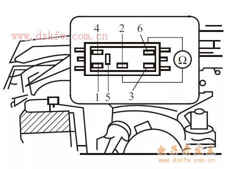 檢查噴油閥電阻器的電阻值,如下圖所示,2-6、2-4、2-3、2-1之間的電阻值應為5.5~6.5Ω。