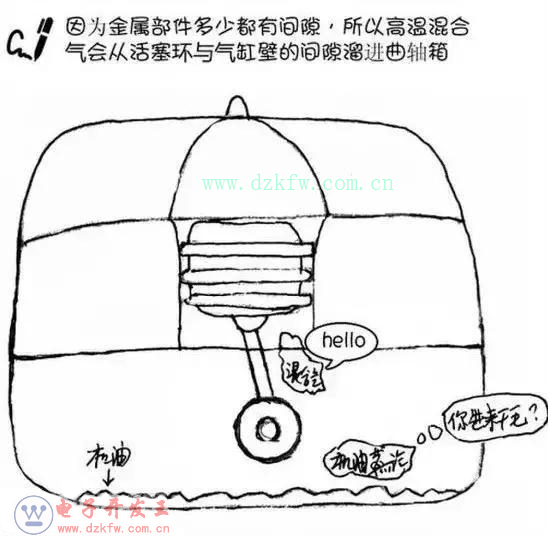 平時(shí)機(jī)油都呆在曲軸箱下部(也就是大家說的油底殼啦),最多通過機(jī)油泵提升到缸體和缸蓋上部,為發(fā)動(dòng)機(jī)提供潤滑和冷卻,按理說出不去的。但是機(jī)油在曲軸箱內(nèi),有人來搗亂了,這就是燃燒室內(nèi)的高溫混合氣,它從活塞環(huán)的間隙偷偷溜進(jìn)了曲軸箱,還把這里面搞的壓力山大……