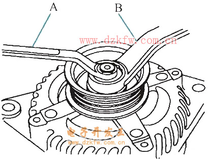 3. 如果需要更換前軸承,用合適規格的扳手A和22mm扳手B拆下皮帶輪鎖緊螺母。如有必要,使用沖擊扳手。