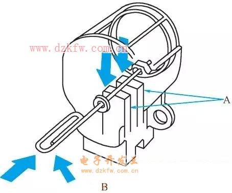 19. 推入電刷A,然后插入銷或鉆頭B (直徑約1.6mm)以將其固定。