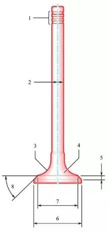 1—凹槽;2—氣門桿直徑;3—內圓角;4—氣門頭;5—氣門座高;6—氣門頭直徑;7—氣門座直徑;8—氣門座角度