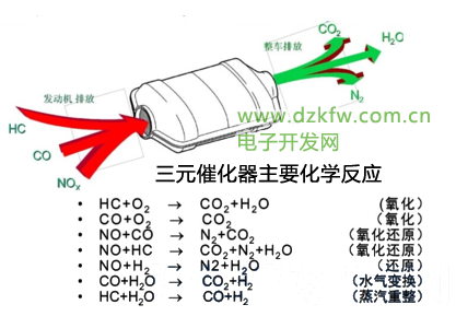 發動機通過排氣管排氣時,CO、HC、和NOx三種氣體通過三元催化反應器中的凈化劑時,增強了三種氣體的活性,進行氧化----還原化學反應。