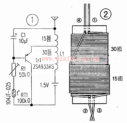 圖1電路是一產生間隙脈沖的發射機。利用晶體管Tr1對線圈電流的通、斷進行控制,發射頻率約3MHz~30MHz。線圈L1需自制,截取一段喝飲料用的吸管,直徑約Φ6mm,用Φ0.26mm的漆包線先密繞30匝,再在其上密繞15匝:在吸管適當位置用針扎出小孔,以穿繞線圈的頭、尾作固定.如圖2。溫度傳感器采用負溫度系數熱敏電阻(NTC),25℃時的阻值為100kΩ。R1是溫度補償電阻,阻值約27kΩ。伴隨著溫度的升高.熱敏電阻的阻值下降,“咔嗒”聲的周期也變短.即每秒鐘“咔嗒”聲的次數增多。