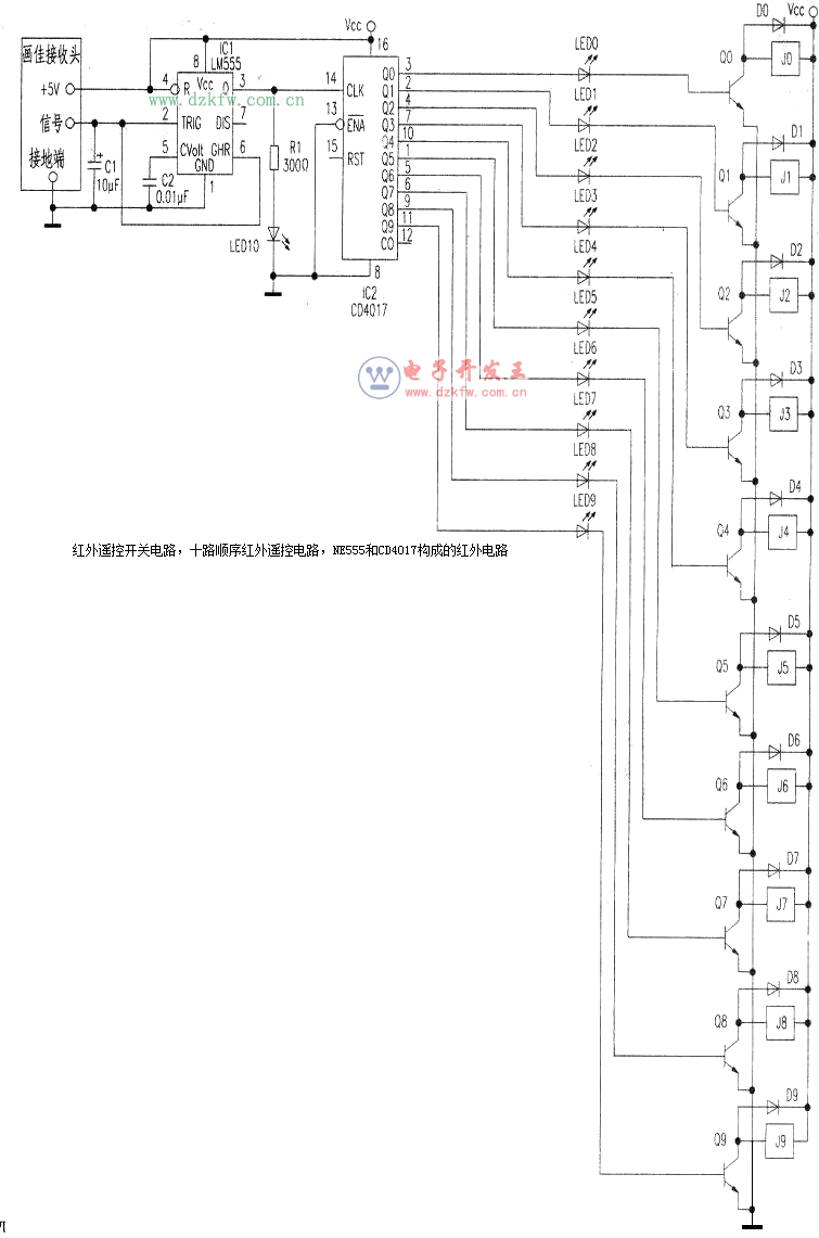 圖中由紅外線接收頭,配合集成電路555和十進制計數器/時序譯碼集成塊CD4017等元器件,構成十路順序控制電路。當電路接通后,若遙控發射器不發射紅外線脈沖信號時,紅外線接收頭在靜態時信號端為高電平,此時該接收電路無控制輸出。當紅外接收頭接收到遙控發射器發出的紅外線脈沖信號時,紅外線接收頭中的紅外線接收二極管將接收到的光脈沖信號轉換成電脈沖信號,微弱的電信號由接收頭內的自動偏壓控制放大器放大,再經過限幅、濾波、檢波、整形,最后獲得標準的負脈沖編碼信號。由于紅外線發射器在設計時使用了編碼技術,發射器上每個鍵按下后都會發出各不相同的紅外線編碼脈沖串。
