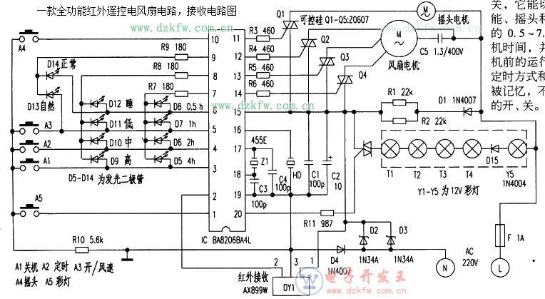 操作說明:A1~A5分別為接收板上的手動微型輕觸開關(guān),A1為關(guān)機(jī)開關(guān),它能切斷風(fēng)扇功能、搖頭和已經(jīng)設(shè)定的0.5~7.5小時關(guān)機(jī)時間,并能記憶關(guān)機(jī)前的運行方式,但定時方式和睡眠方式不被記憶,不能控制彩燈的開、關(guān)。A2為定時關(guān)機(jī)的設(shè)定開關(guān),每按動一次可分別設(shè)定0.5、1、2、4小時的累計定時,并由相對應(yīng)的發(fā)光二極管指示時間的.進(jìn)度,最大可設(shè)定為7.5小時。