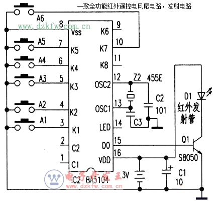 紅外遙控器:電路原理圖見下圖,它是一個由編碼器(BA5104)和紅外發(fā)射電路組成的。經(jīng)對應(yīng)開關(guān)發(fā)出的遙控指令,、由15腳輸出到Q1經(jīng)放大后驅(qū)動D1發(fā)出經(jīng)編碼后的紅外遙控信號。遙控器上由六個鍵組成,除了接收電路板上的五個控制功能鍵外,另增加了一個風(fēng)類鍵,按該鍵即可改變風(fēng)扇由正常風(fēng)一自然風(fēng)。睡眠風(fēng)一正常風(fēng)的方式循環(huán)(在接收板上是沒有風(fēng)類鍵的,如果需要增加,可在IC1的第⑥腳與A1、A2、A3的公共端之間接人一開關(guān),以實現(xiàn)手動操作改變風(fēng)類方式),由于遙控器采用7號電池使得體積較小。