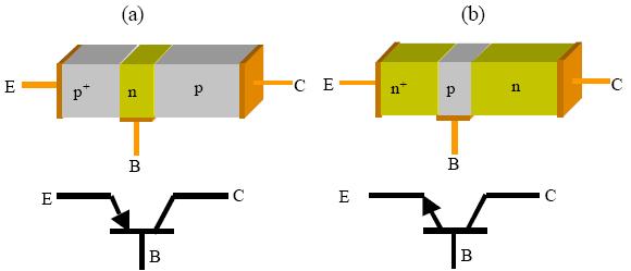 圖1 pnp(a)與npn(b)三極管的結(jié)構(gòu)示意圖與電路符號(hào)。