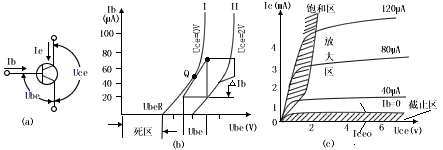 三極管的特性曲線(xiàn) 1、輸入特性 圖2 (b)是三極管的輸入特性曲線(xiàn),它表示Ib隨Ube的變化關(guān)系,其特點(diǎn)是:1)當(dāng)Uce在0-2伏范圍內(nèi),曲線(xiàn)位置和形狀與Uce有關(guān),但當(dāng)Uce高于2伏后,曲線(xiàn)Uce基本無(wú)關(guān)通常輸入特性由兩條曲線(xiàn)(Ⅰ和Ⅱ)表示即可。 2)當(dāng)Ube<UbeR時(shí),Ib≈O稱(chēng)(0~UbeR)的區(qū)段為“死區(qū)”當(dāng)Ube>UbeR時(shí),Ib隨Ube增加而增加,放大時(shí),三極管工作在較直線(xiàn)的區(qū)段。 3)三極管輸入電阻,定義為: rbe=(△Ube/△Ib)Q點(diǎn),其估算公式為: rbe=rb+(β+1)(26毫伏/Ie毫伏) rb為三極管的基區(qū)電阻,對(duì)低頻小功率管,rb約為300歐。 2、輸出特性 輸出特性表示Ic隨Uce的變化關(guān)系(以Ib為參數(shù))從圖9(C)所示的輸出特性可見(jiàn),它分為三個(gè)區(qū)域:截止區(qū)、放大區(qū)和飽和區(qū)。 截止區(qū)當(dāng)Ube<0時(shí),則Ib≈0,發(fā)射區(qū)沒(méi)有電子注入基區(qū),但由于分子的熱運(yùn)動(dòng),集電集仍有小量電流通過(guò),即Ic=Iceo稱(chēng)為穿透電流,常溫時(shí)Iceo約為幾微安,鍺管約為幾十微安至幾百微安,它與集電極反向電流Icbo的關(guān)系是: Icbo=(1+β)Icbo 常溫時(shí)硅管的Icbo小于1微安,鍺管的Icbo約為10微安,對(duì)于鍺管,溫度每升高12℃,Icbo數(shù)值增加一倍,而對(duì)于硅管溫度每升高8℃, Icbo數(shù)值增大一倍,雖然硅管的Icbo隨溫度變化更劇烈,但由于鍺管的Icbo值本身比硅管大,所以鍺管仍然受溫度影響較嚴(yán)重的管,放大區(qū),當(dāng)晶體三極管發(fā)射結(jié)處于正偏而集電結(jié)于反偏工作時(shí),Ic隨Ib近似作線(xiàn)性變化,放大區(qū)是三極管工作在放大狀態(tài)的區(qū)域。 飽和區(qū)當(dāng)發(fā)射結(jié)和集電結(jié)均處于正偏狀態(tài)時(shí),Ic基本上不隨Ib而變化,失去了放大功能。根據(jù)三極管發(fā)射結(jié)和集電結(jié)偏置情況,可能判別其工作狀態(tài)。