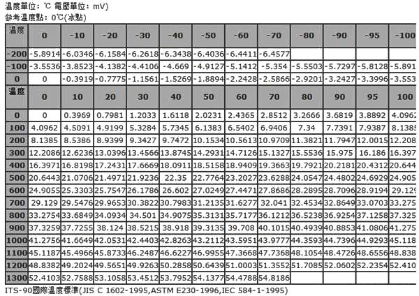 K型熱電偶分度表
