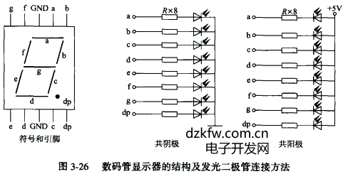 數碼管顯示器的引腳排列及發光二極管連接方法如圖3—26所示。下圖是七段數碼管的示意圖