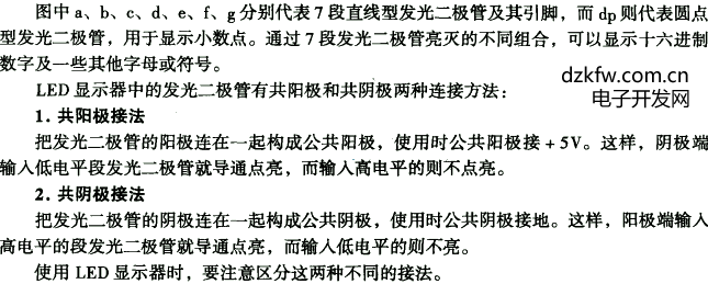 LED是發光二極管的縮寫。數碼顯示器是由7段發光二極管構成的,應用非常普遍。除此之外,還有液晶顯示器(LCD)、真空熒光顯示器(VFD)、等離子顯示器(PDP),本章只介紹數碼顯示器和液晶顯示器。