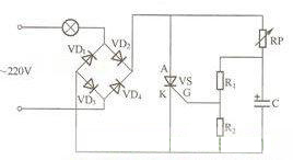 圖4所示是一個簡單實用的調光臺燈電路。調節RP的阻值,可改變電容C充電達到UG值得時間,即調整晶閘管的導通角,使晶閘管早一點或遲一點觸發導通,從而調節晶閘管的輸出電壓,使燈兩端電壓能在0~220V間變化。電壓高,燈發光亮;電壓低,燈發光暗。