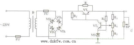 直流穩壓電源電路如圖所示。一般R4可選小功率碳膜電位器、RP選大功率的線繞滑動式電位器。調節R4的阻值可改變輸出電壓U的高低,調節RP可測試電源的帶負載能力。