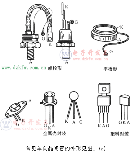 單向晶閘管按功率大小,可分為小功率、屮功率和大功率三種。一般從外觀上即可進行識別:小功率管多采用塑封或金屬殼封裝;中功率管控制極引腳比陰極引腳細,陽極帶有螺栓;大功率管控制極上帶有金厲編織套,像一條辮子。一般額定電流小于200A的多為螺栓形晶閘管,大于200A的多為平板形晶閘管。