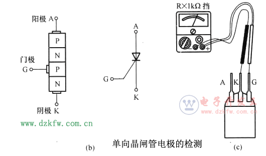由單向晶閘管的結構可知,G極和K極間是一個PN結,類似一只二極管,具有單向導電特性,其正、反向阻值相差很大。而G極和A極間有兩個反向串聯的PN結,因此正、反向阻值均很大,據此可利用萬用表判別出電極。