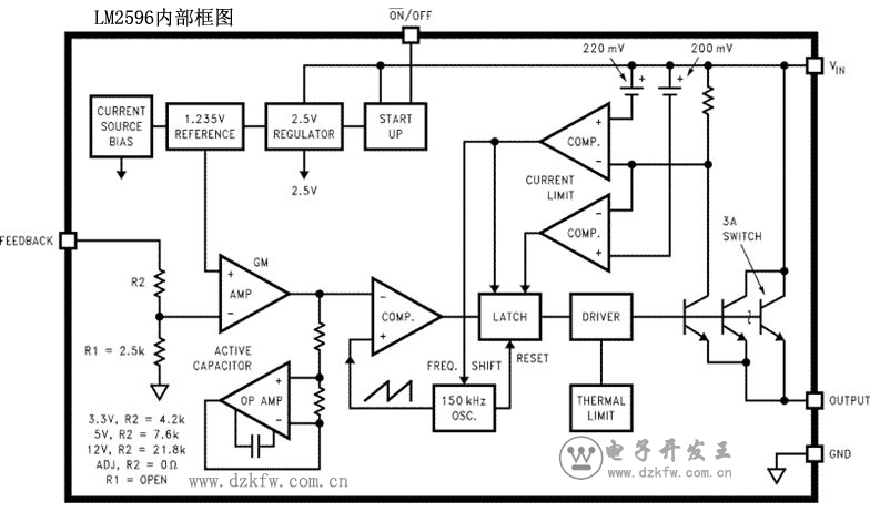 LM2596內部包含150KHZ振蕩器、1.23v基準穩壓電路、熱關斷電路、電流限制電路、放大器、比較器和內部