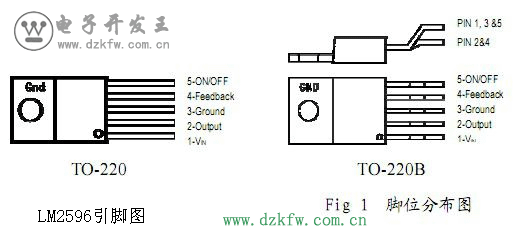 右圖為LM2596芯片引腳示意圖。1為+VIN,2為out put,3為gnd,4為feed back,5為on/off。