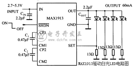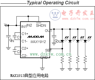 MAX1913的輸入電壓范圍為2.7~5.3V,它可提供穩定的輸出電壓或輸出電流,以驅動白光LED。MAX1913驅動白光LED電路如圖所示。它只需4個小陶瓷電容而無 須電感就能完整地組成DC/DC調節器。其獨特的電荷泵設計可使輸入紋波減小,且能在很寬的負載范圍內維持穩定的750kHz開關頻率。MAX1913還包括邏輯電平關 斷和軟啟動功能,以減小啟動時的輸入浪涌電流。其主要特性如下。