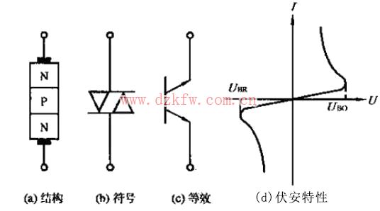 如下圖是雙向觸發二極管的結構、符號、等效電路及伏安特性圖。
