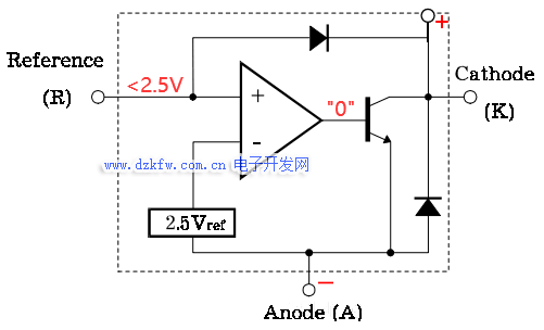 如圖3所示,為TL431的內部功能框圖,但并不是其真正的內部構造,只是用來簡單輔助說明一下原理。假設電源正極連接陰極K端,電源負極連接陽極A端。當參考端R端電壓>2.5V時,運放輸出低電平“1”,三極管基極電壓為高,則三極管集電結和發射結導通,相當于陰極和陽極導通,會拉低K端電壓,則需要在電源正極和陰極之間接一個限流電阻;當參考端R端電壓<2.5V時,運放輸出低電平“0”,三極管基極電壓為低,則三極管集電結和發射結均反偏,三極管截止,并聯二極管也截止,此時VKA=電源電壓。