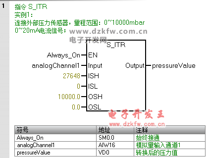 假設模擬量輸入模塊連接的外部壓力傳感器,輸入信號為0~20mA的電流信號,壓力的范圍為0~10000 mbar,輸入通道的地址為:AIW16,轉換后數據存放在VD0中,則代碼如下:
