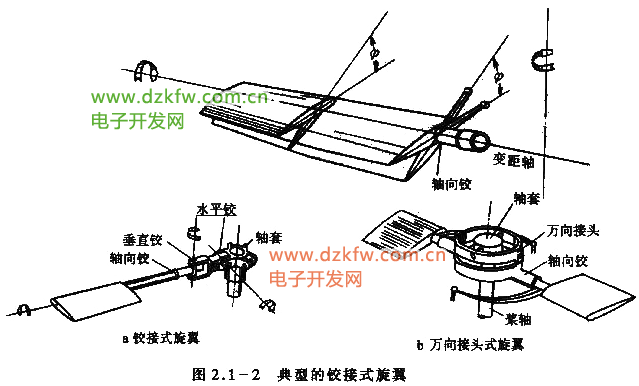 (3)產生其他分力及力矩對直升機; 進行控制或機動飛行,類似于飛機上各操縱面的作用。 旋翼由數片槳葉及一個槳轂組成。工作時,槳葉與空氣作相對 運動,產生空氣動力;槳轂則是用來連接 槳葉和旋翼軸,以轉動旋翼。槳葉一般通過鉸接方式與槳轂連接(如下圖所示)。