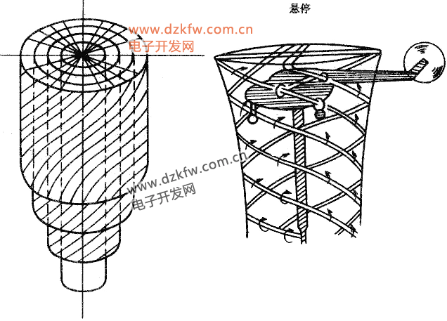 這套渦系模型完全與推進螺旋槳的情況相同。至于旋冀在前飛狀態的渦系模型,可以合 理地引伸為一個半無限長的斜向渦柱,由一圓形渦盤的附著渦系及多層斜向螺旋渦線的斜向渦面的尾跡渦系兩部分所構成(如下圖所示)。